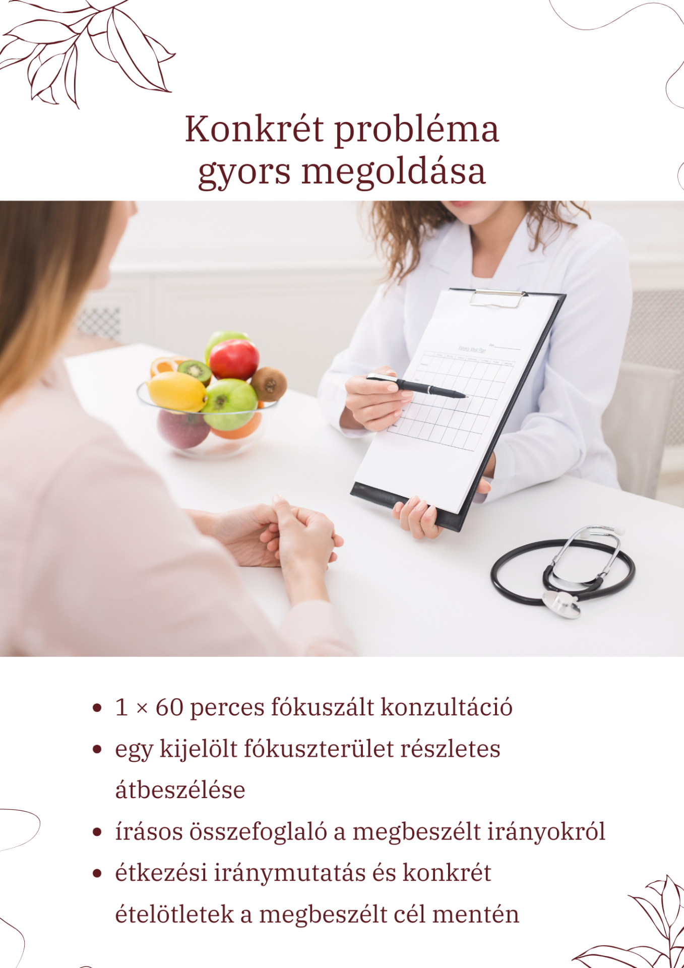 Ha van egy konkrét kérdésed vagy elakadásod az étkezéseddel vagy életmódoddal kapcsolatban, ez az alkalom segít rendszerezni a gondolataidat és irányt adni a továbblépéshez.